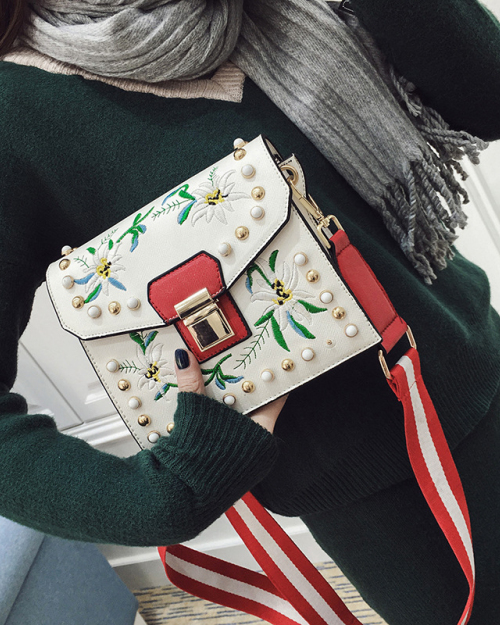 Fashion Embroidery Flower Decorative White PU Crossbody Bag