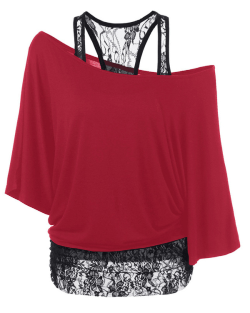 Trendy Dew Shoulder Lace Combination Red Cotton Tops