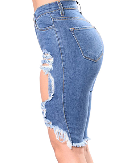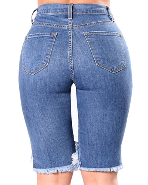 Cotton Solid Zipper Fly High Regular Capris Jeans