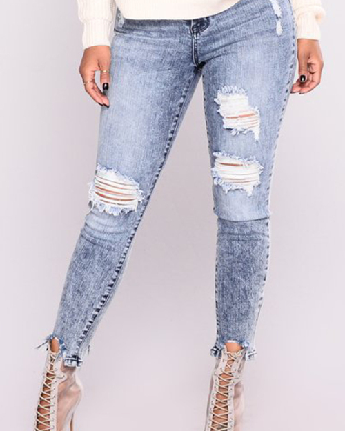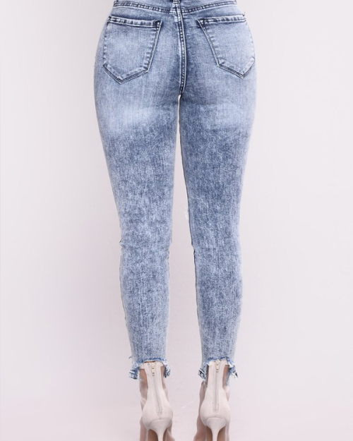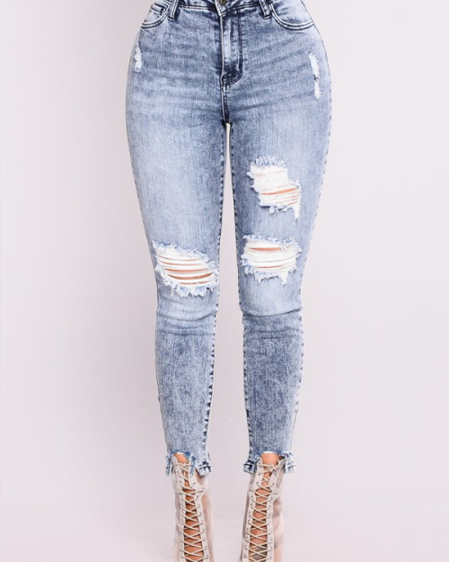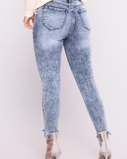 Euramerican High Waist Broken Holes Zipper Design Dark Blue Denim Pants