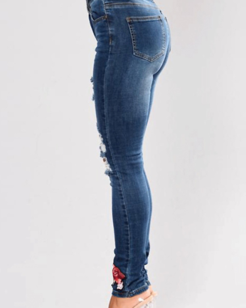 Fashion Mid Waist Broken Holes Embroidered Design Dark Blue Denim Pants