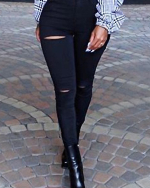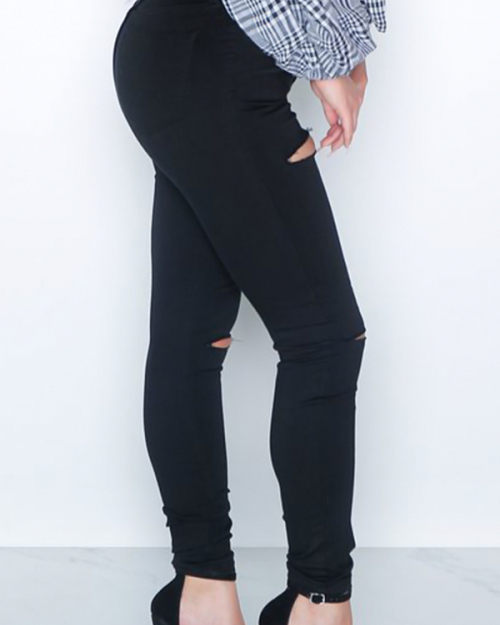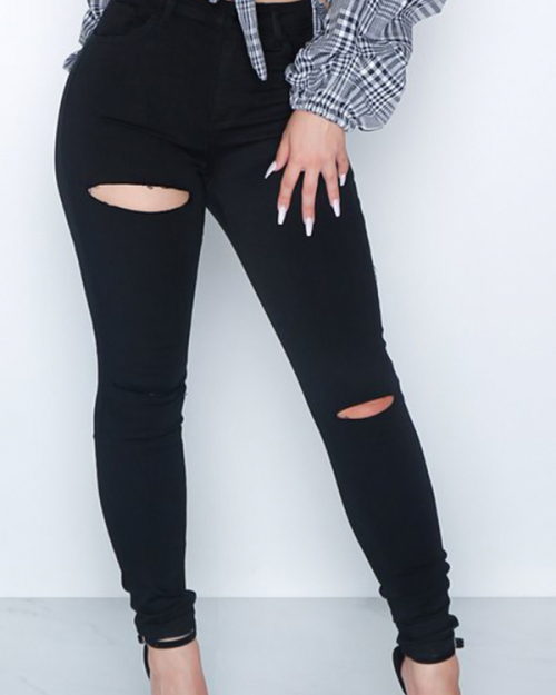 Fashionable High Waist Broken Holes Black Denim Pants