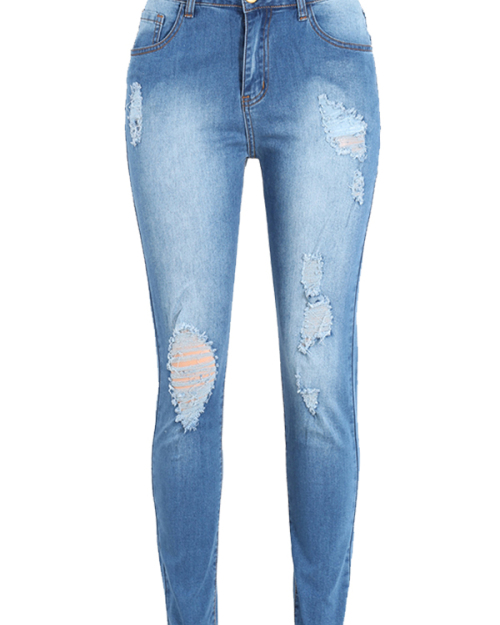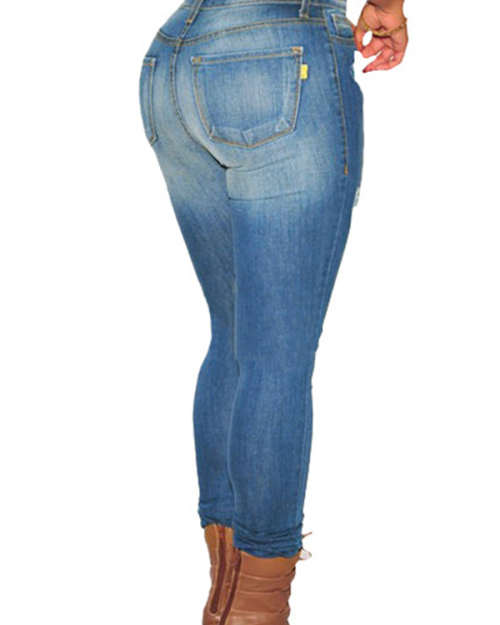 Fashionable Mid Waist Broken Holes Blue Denim Zipped Pants