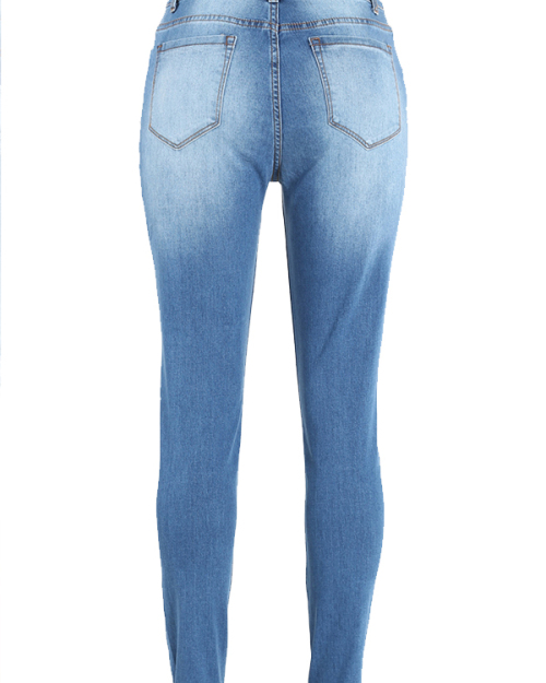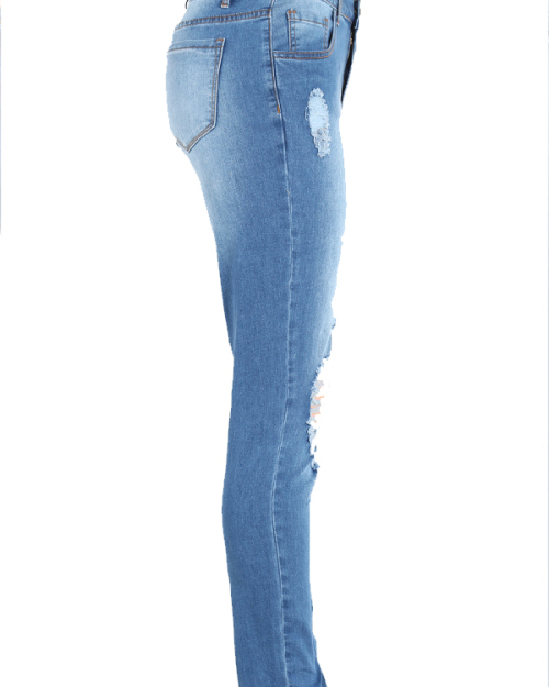 Fashionable Mid Waist Broken Holes Blue Denim Zipped Pants