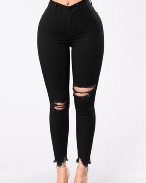 Leisure High Waist Broken Holes Black Cotton Jeans