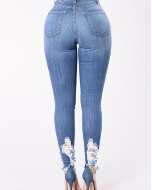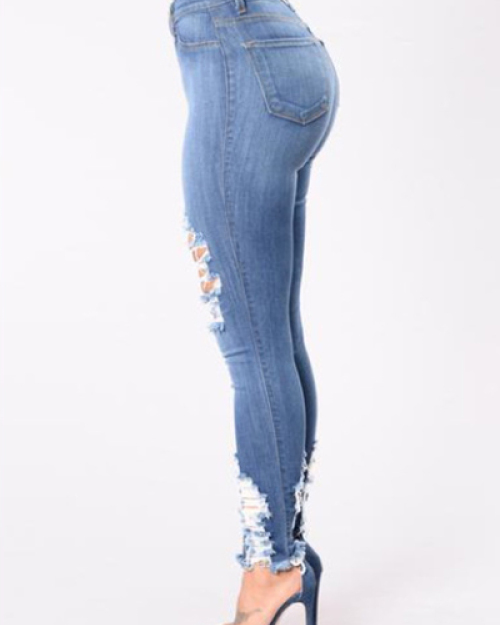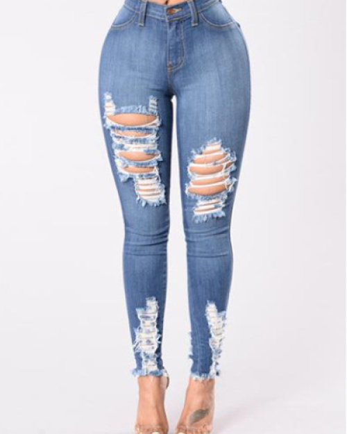 Stylish High Waist Broken Holes Light Blue Cotton Jeans