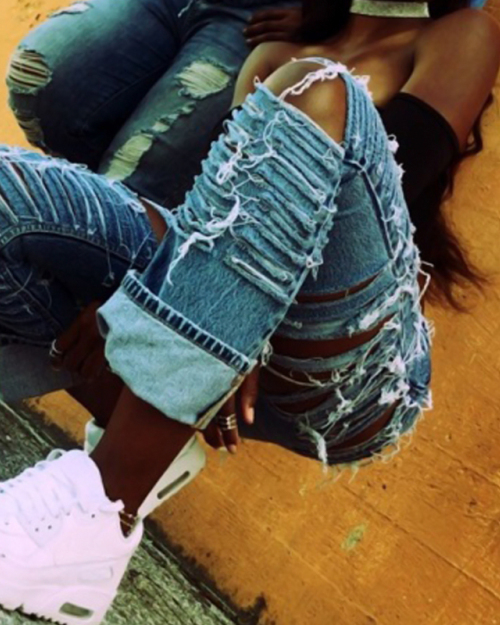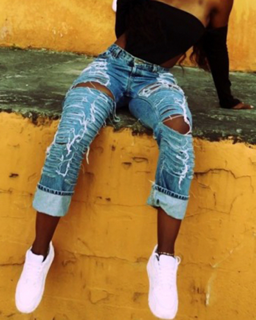 Stylish High Waist Broken Holes Light Blue Denim Pants