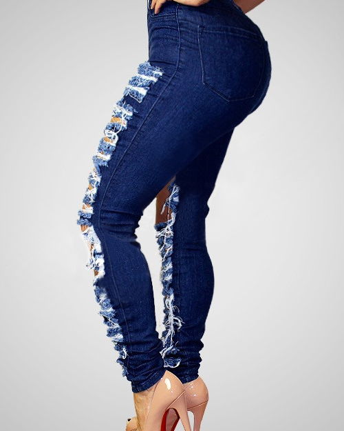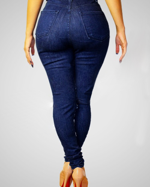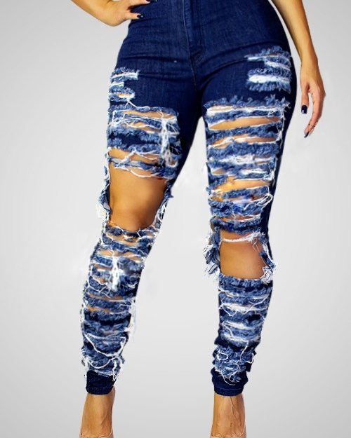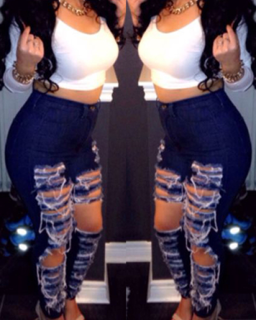 Stylish High-Waisted Hollow-out Design Blue Denim Jeans