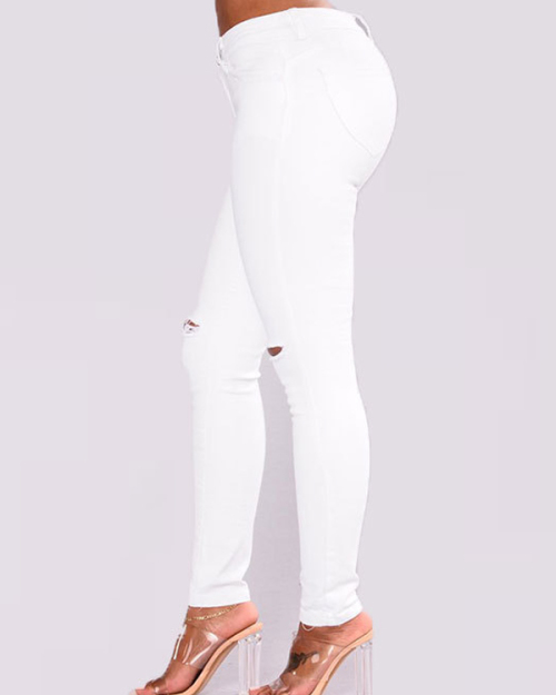 Stylish Mid Waist Broken Holes White Denim Pants