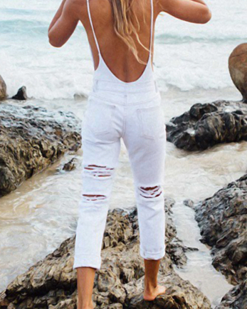 Trendy Mid Waist Broken Holes White Denim Jeans