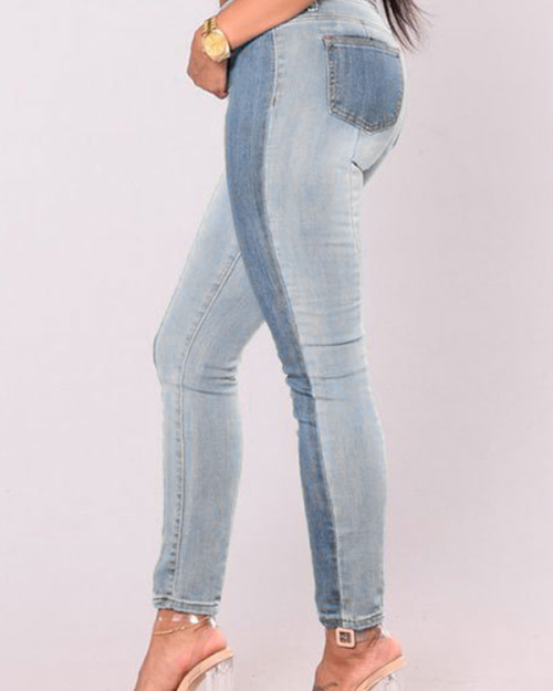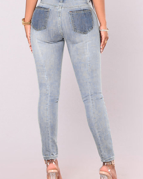 Trendy Mid Waist Patchwork Light Blue Denim Pants