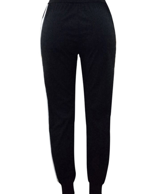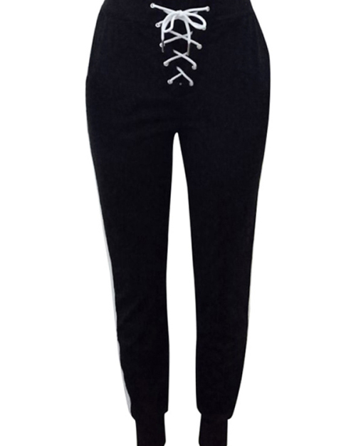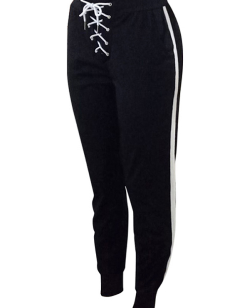 Leisure Elastic Waist Lace-up Black Cotton Blends Pants