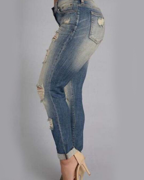 Euramerican High Waist Broken Holes Blue Polyester Pants