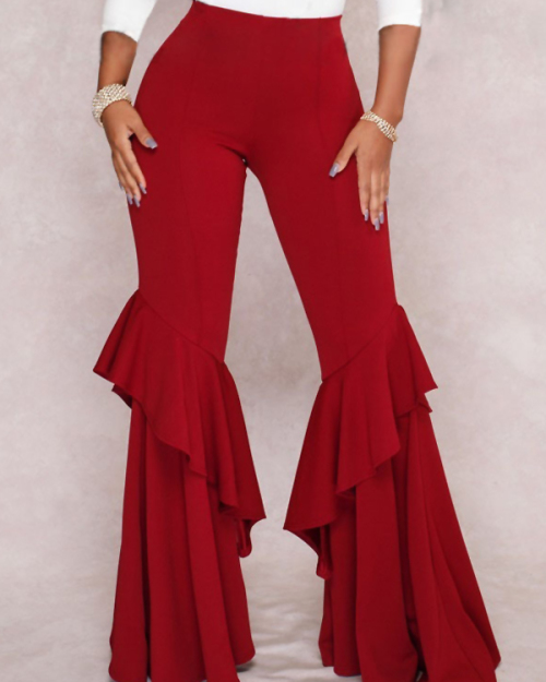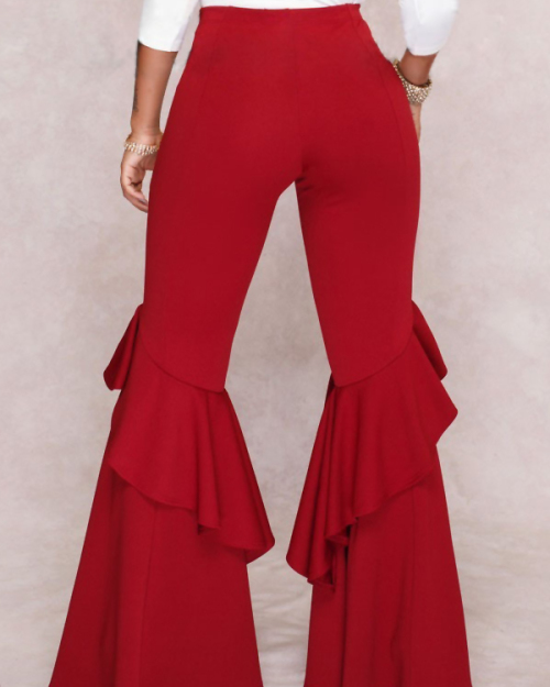 Euramerican Mid Waist Falbala Design Red Polyester Wide Leg Pants