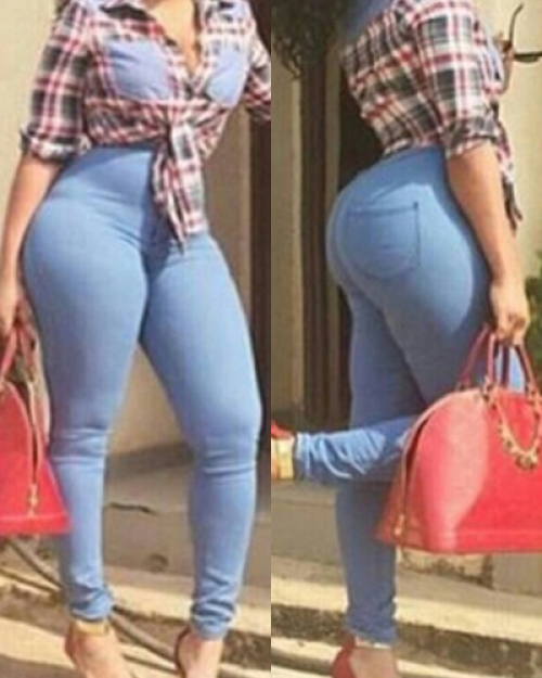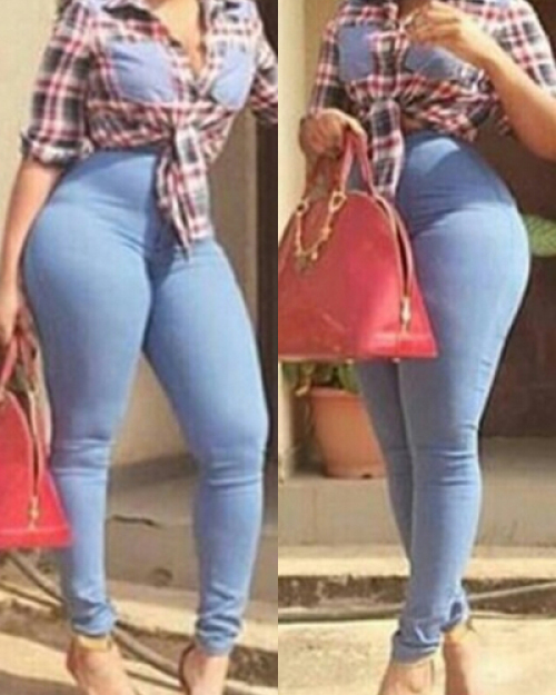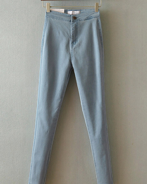 Fashion Button Fly Design Solid Blue Elastic Denim Skinny Pants
