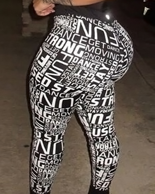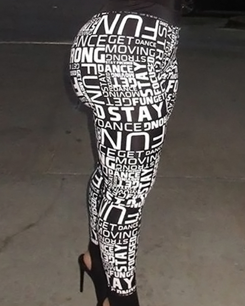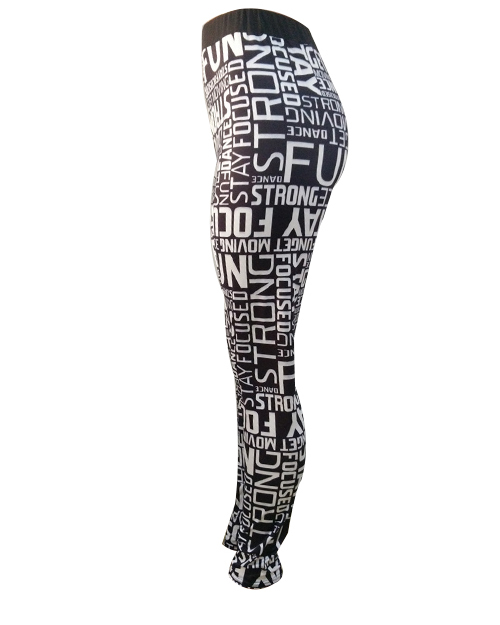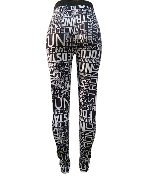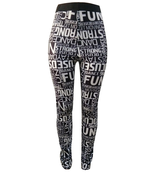 Fashion High Elastic Waist Letters Printed Black Polyester Leggings