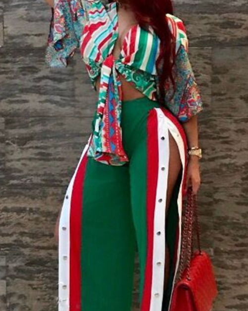 Stylish Elastic Waist Patchwork Green Polyester Pants