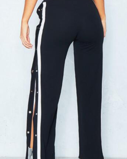 Trendy Elastic Waist Side Split Black Polyester Pants