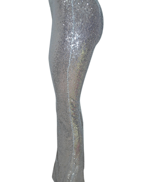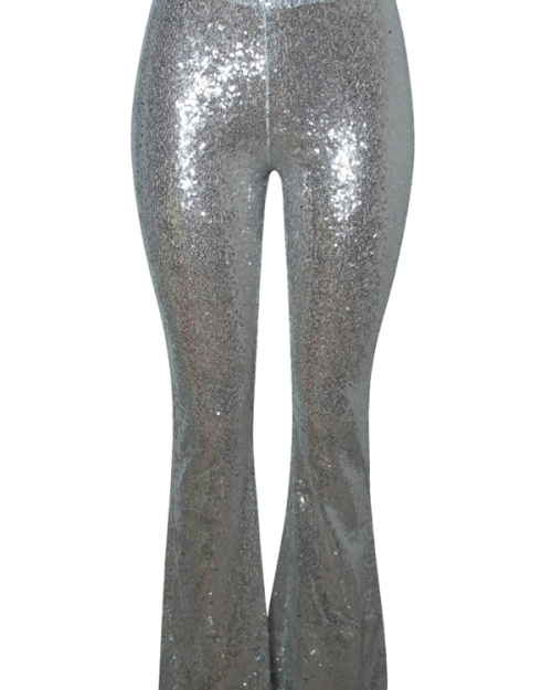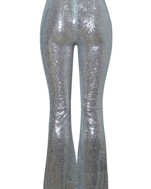 Trendy Low Elastic Waist Sequins Decoration Silver Polyester Flared Trousers