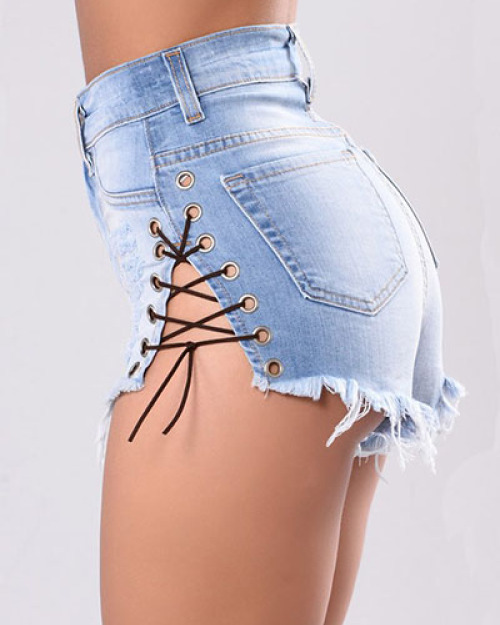 Trendy High Waist Lace-up Hollow-out Light Blue Denim Shorts