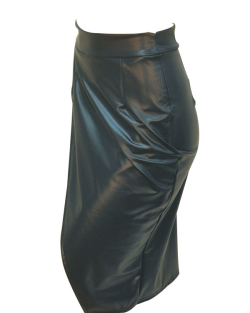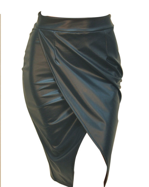 Trendy High Waist Front Split Black-green Leather Knee Length Skirts
