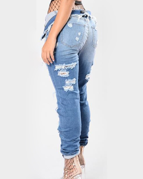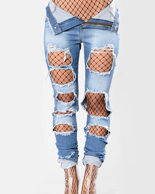 Stylish High Waist Broken Holes Blue Denim Jeans