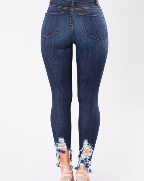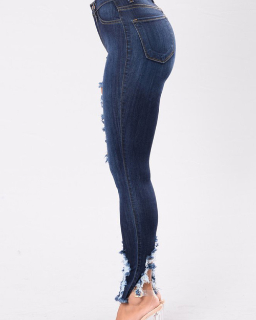 Stylish High Waist Broken Holes Dark Blue Denim Pants