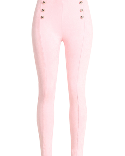 Stylish High Waist Double-breasted Decorative Pink Cotton Skinny Pants