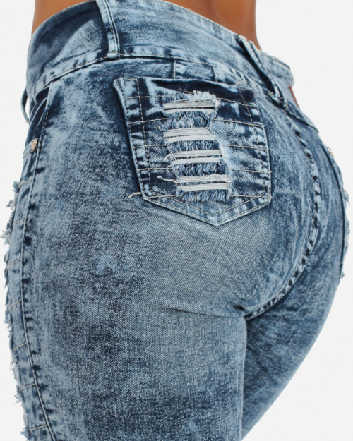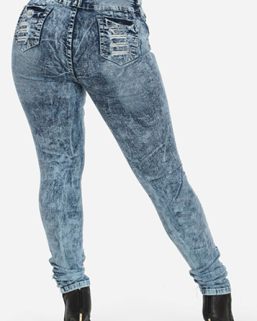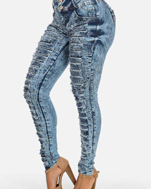 Stylish Mid Waist Hollow-out Design Blue Denim Skinny Jeans