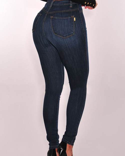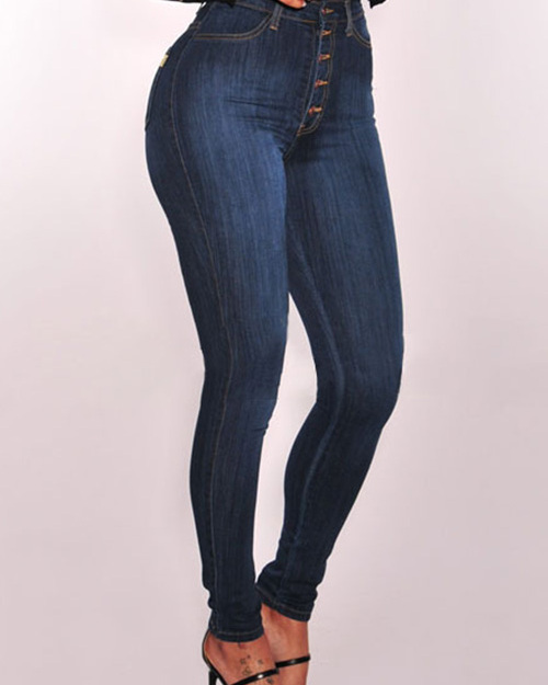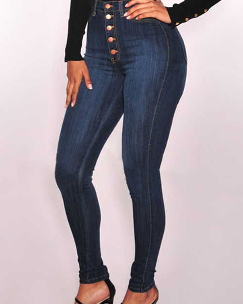 Trendy High Waist Button Design Dark Blue Denim Jeans