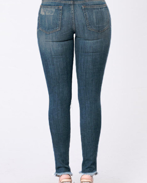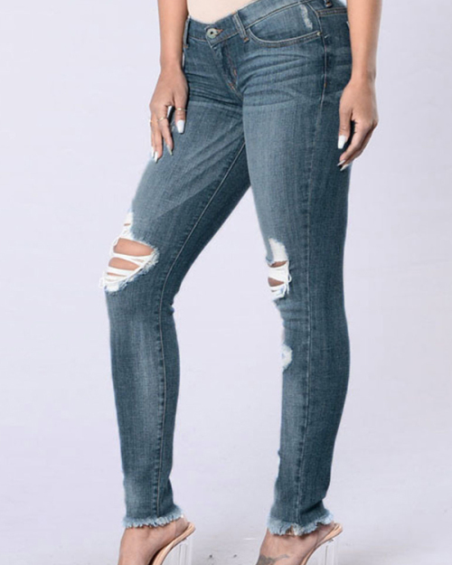 Trendy Mid Wasit Broken Holes Dark Blue Denim Pants