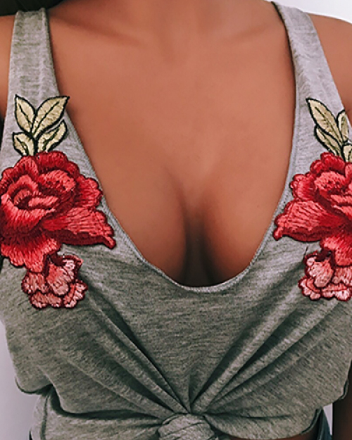 Leisure V Neck Tank Sleeveless Flowers Decoration Grey Polyester T-shirt