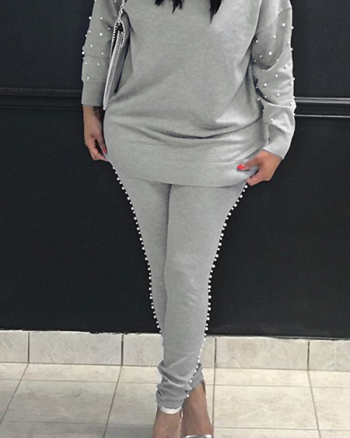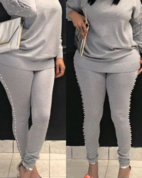 Casual Round Neck Pearl Decoration Grey Blending Two-Piece Pants Set
