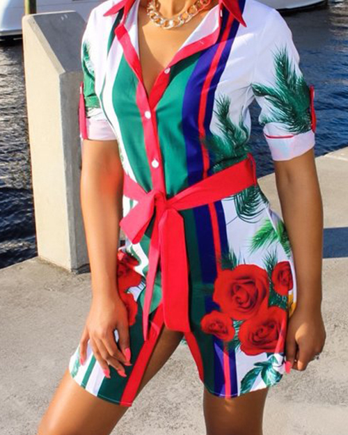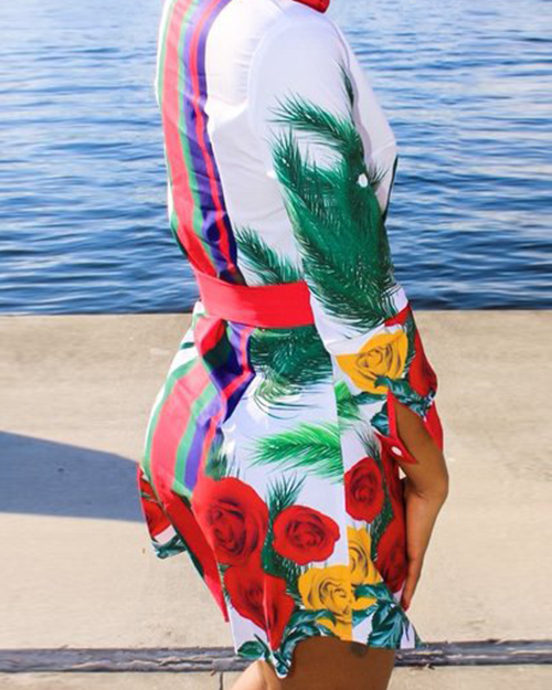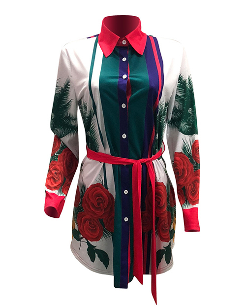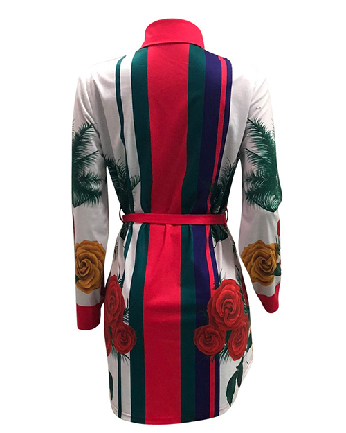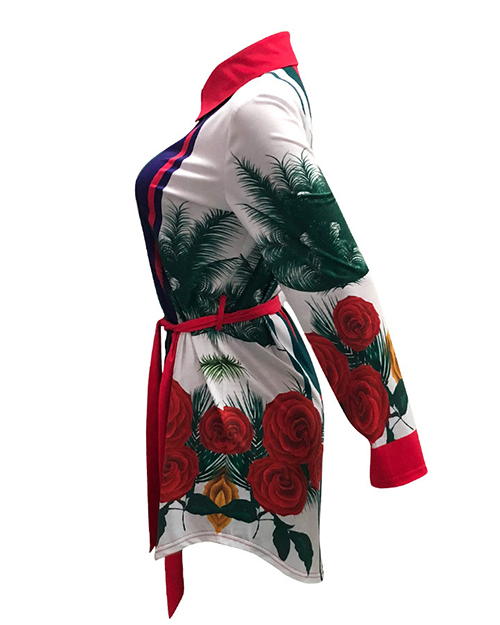 Casual Turndown Collar Printed White Cotton Blend Mini Shirt Dress(With Belt)