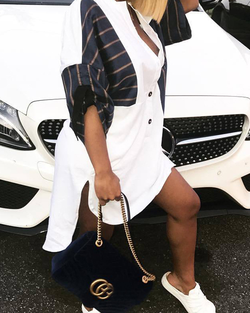 • Casual V Neck Asymmetrical Black+White Cotton Blend Knee Length Dress