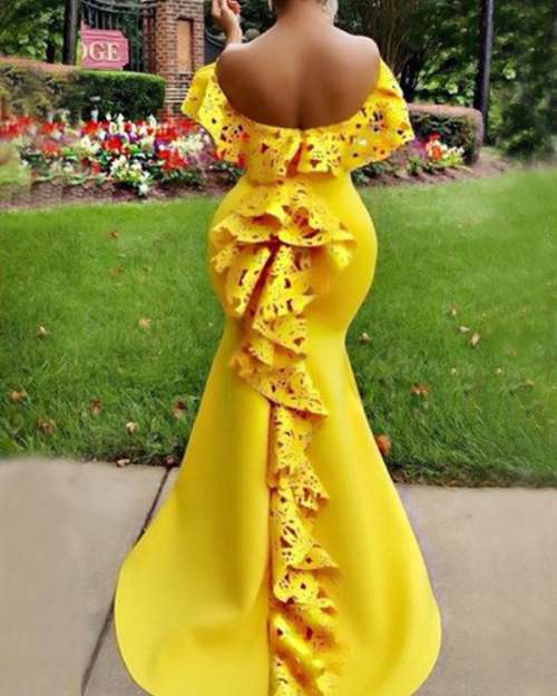Charming Dew Shoulder Falbala Design Yellow Polyester Floor length Dress