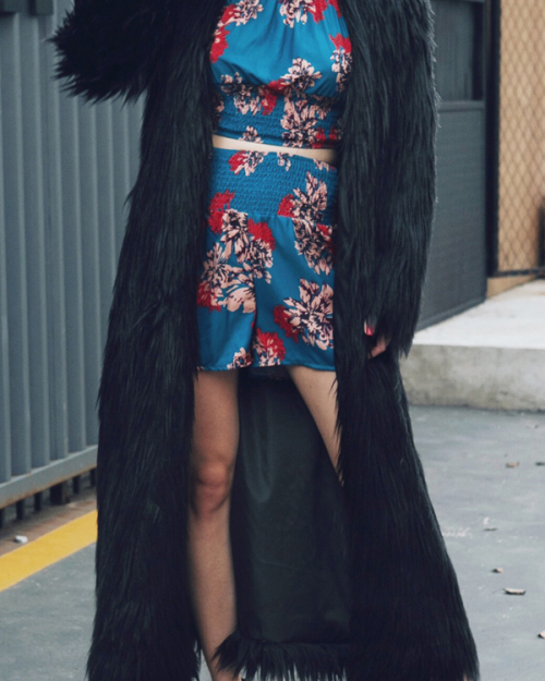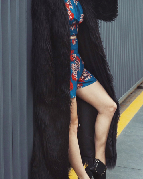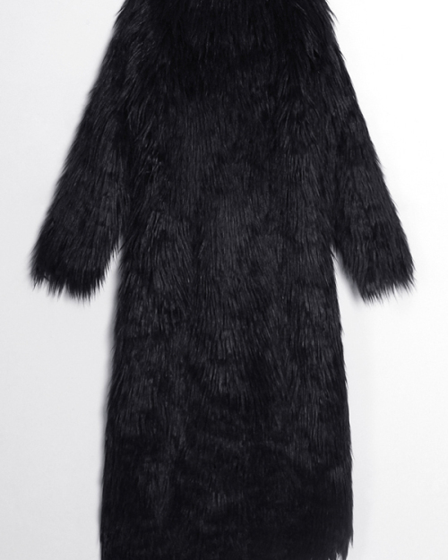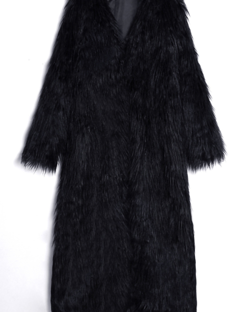 Fashionable V Neck Long Sleeves Black Faux Fur Long Coat