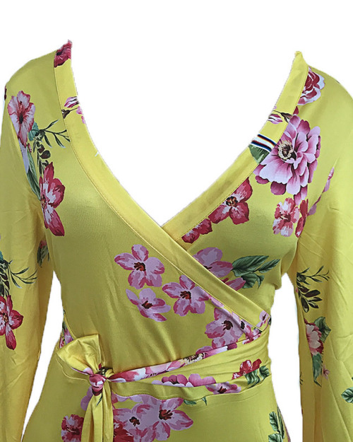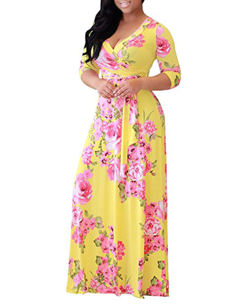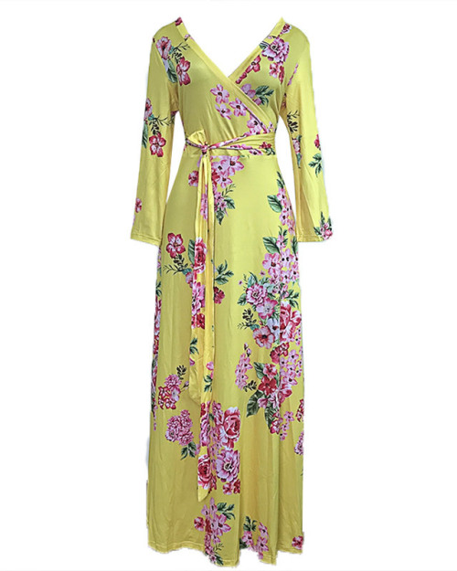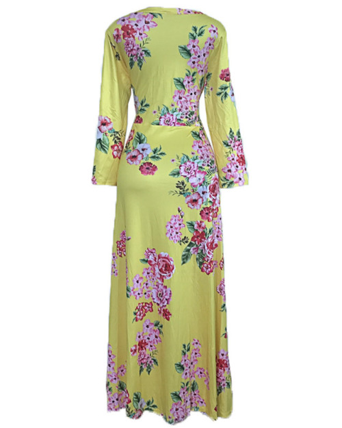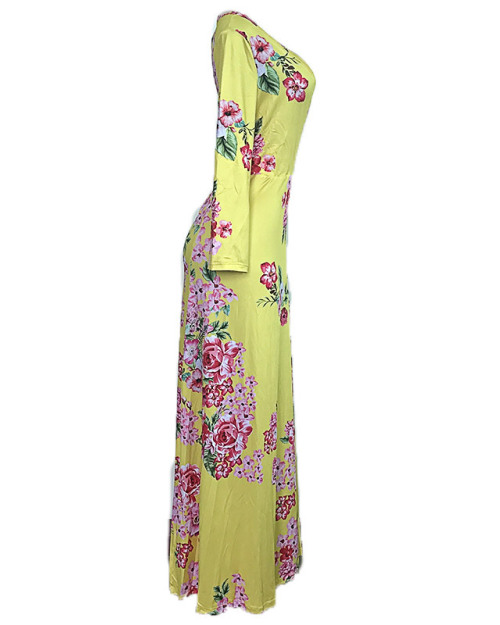 Leisure Round Neck Pocket Design Yellow Polyester Floor Length Dress