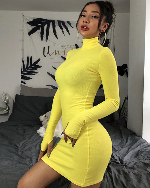 2019 Solid color dress with long sleeves high collar dress #95133