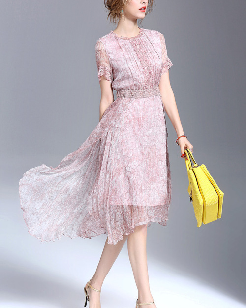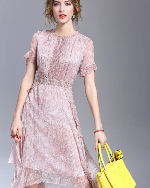 2019 Summer New European Station Women Fashion Silk Print Short Sleeve Slim Dress Maxi Dress #94999