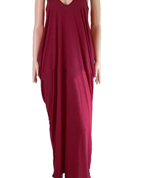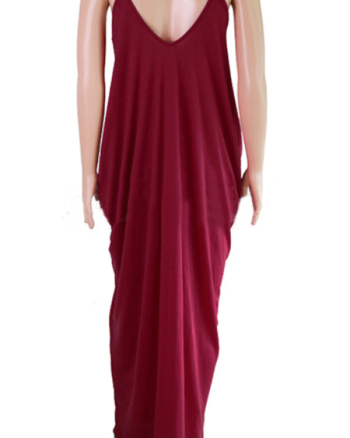 Alluring V Neck Spaghetti Strap Sleeveless Asymmetrical Wine Red Cotton Blend Ankle Length Dress