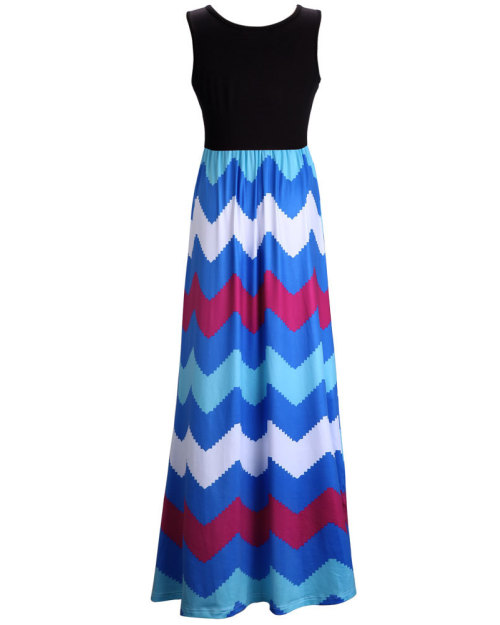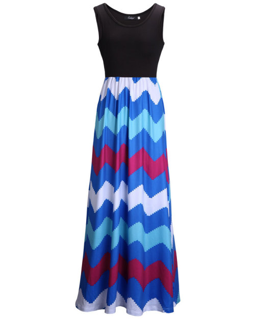 Bohemian Style U Neck Tank Sleeveless Patchwork Colorful Wavy Print Blue Blending Ankle Length Dress