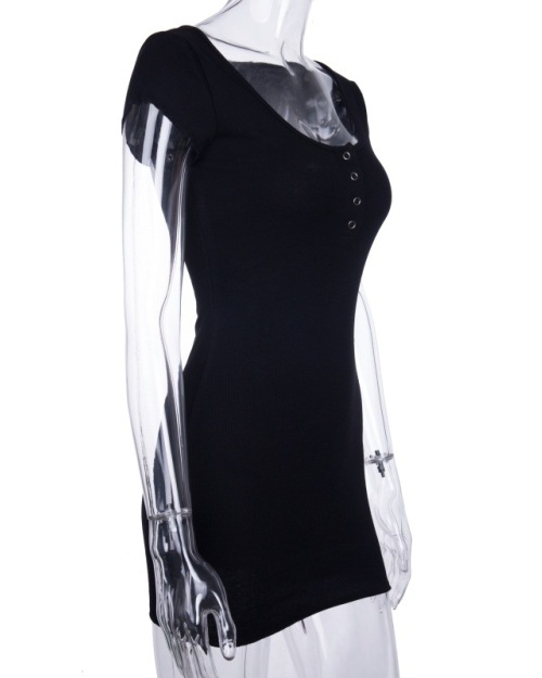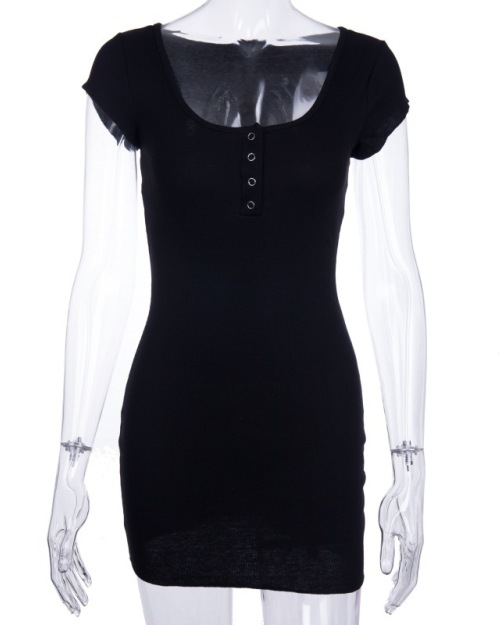 Button solid color package hip one-step dress sexy women's short sleeve dress #95128