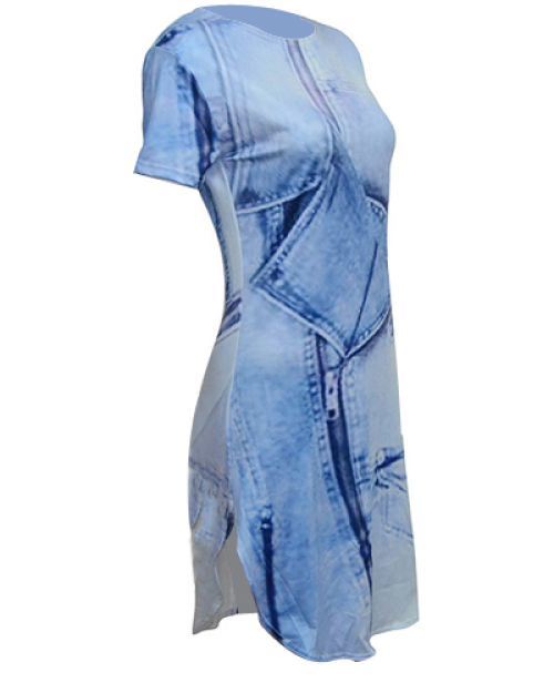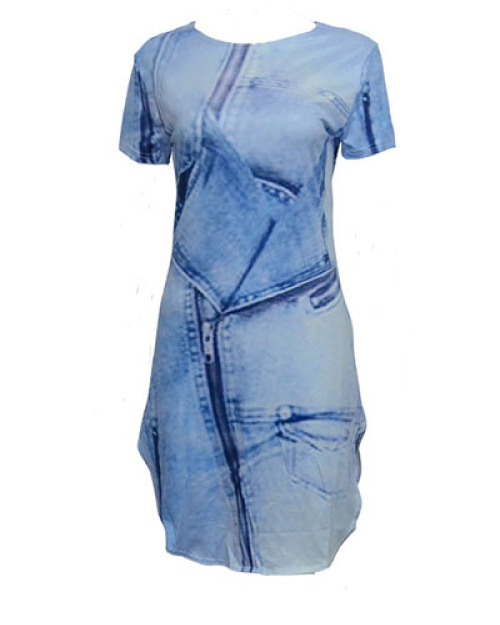 Casual Round Neck Short Sleeves Asymmetrical Blue Polyester Sheath Mini Dress