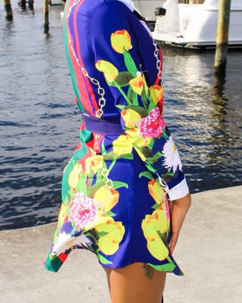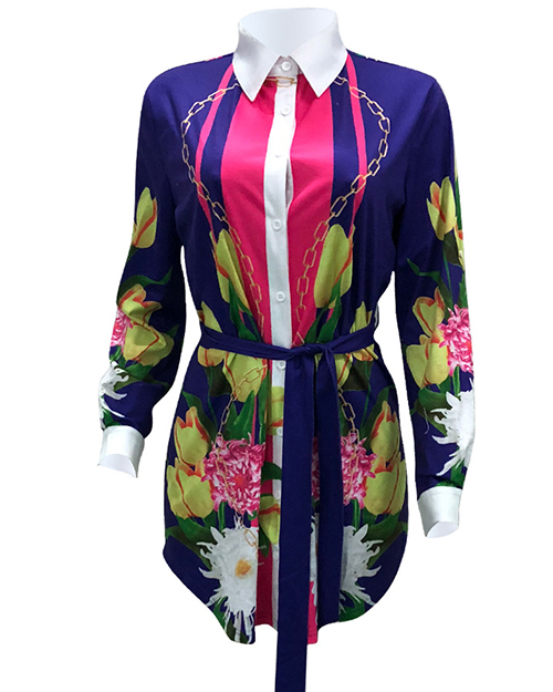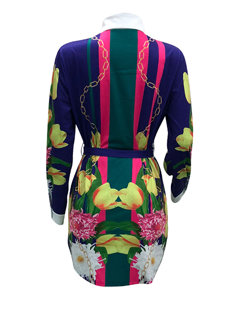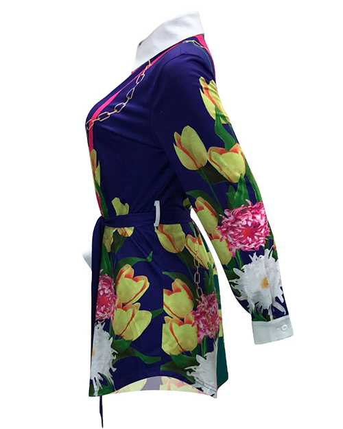 Casual Turndown Collar Printed Blue Cotton Blend Mini Shirt Dress(With Belt)