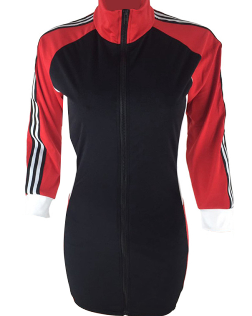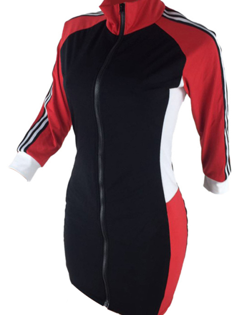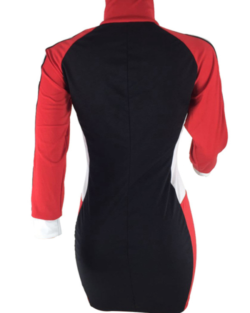 Casual Turtleneck Patchwork Red Polyester Sheath Mini Zipped Dress