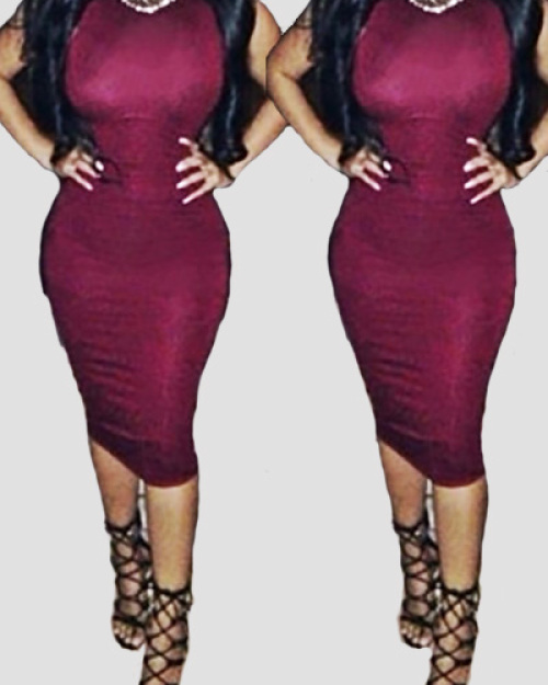 Casual Turtleneck Short Sleeves Wine Red Spandex Sheath Knee Length Dress
