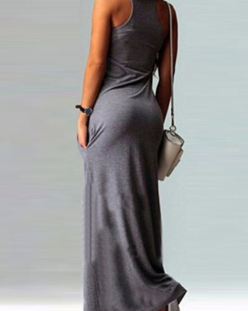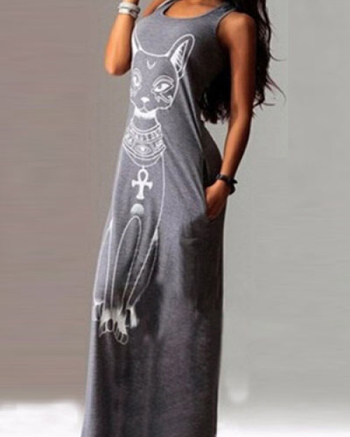 Casual U-shaped Neck Tank Sleeveless Cartoon Cat Print Grey Cotton Sheath Ankle Length Dress