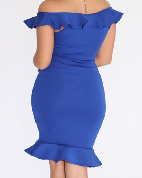 Charismatic V Neck Short Sleeves Falbala Design Blue Polyester Knee Length Dress