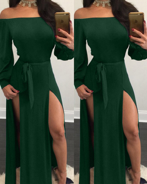 Charming Bateau Neck Long Sleeves High Split Green Qmilch Ankle Length Dress